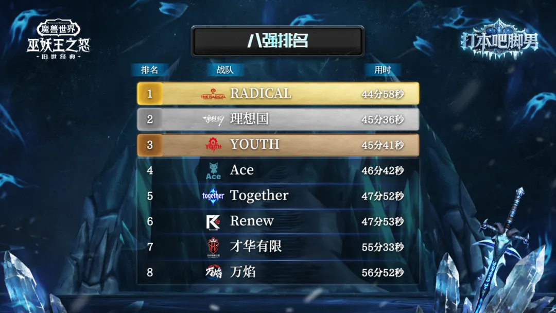 恭喜来自席瓦莱恩服务器的【THE RADICAL】公会以44分58秒的成绩获得冰冠堡垒竞速赛冠军.同时恭喜来自埃提耶什服务器的【理想国】公会与来自布鲁服务器的【Youth】公会分别获得亚军及季军的荣誉。