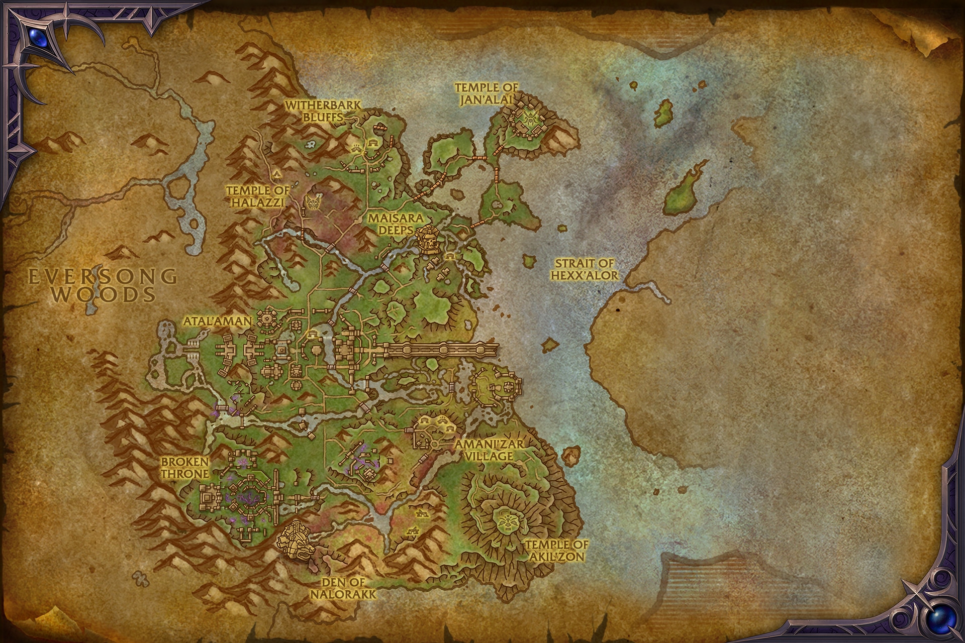 - 新区域 – 祖阿曼:一处扩展区域,阿曼尼巨魔的家园。该地区属温带气候,青山环绕,密林遍布。